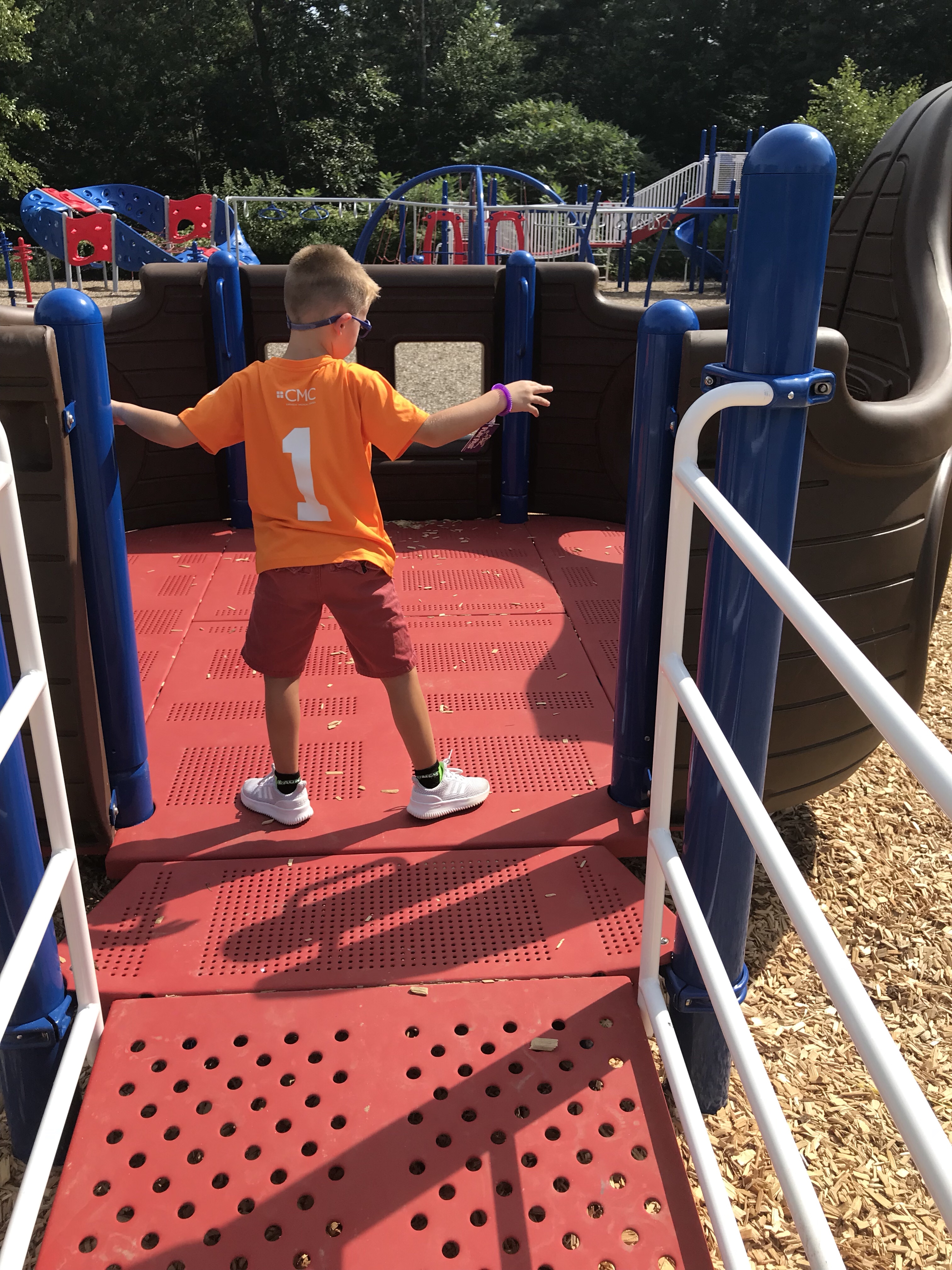 Sawyer enjoys the monkey bars, pretending to hunt for treasures, and repeating tv show openings so he can hear the same theme song. This is where he is developmentally. Though he is 7.5 years old, he behaves more like that of a 5 year old in many ways.